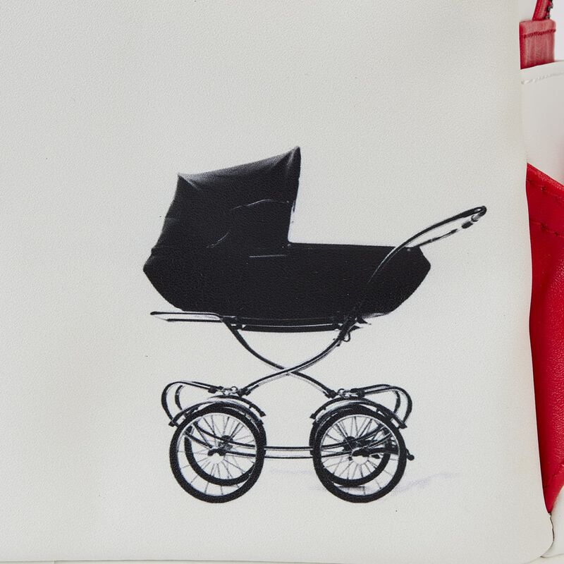 Guess who’s out and about! Doll up your wardrobe with our Loungefly Annabelle Cosplay Mini Backpack. This hauntingly fashionable accessory features an applique of Annabelle’s head, rising up over the top edge of the backpack. Real bow ribbons are fastened to her braided pigtails, and shiny red satin ribbon details complement the white background of her dress. A ruffle applique over the front pocket adds an authentic touch, and a 3D red faux satin rose completes the look. On the back, you’ll find a printed image of a baby carriage. Conjure up plenty of adventures with this wickedly fun accessory.